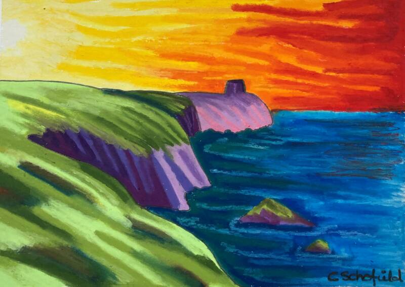 Painted by my daughter Ceri Schofield, she says is "inspired by the many sunsets she has seen standing on the cliff tops above Abereiddy. She loves how the setting sun emphasises the cliff tops looking over towards the tower and the distinctive purple rocks that make up the cliffs in that part of West Wales.